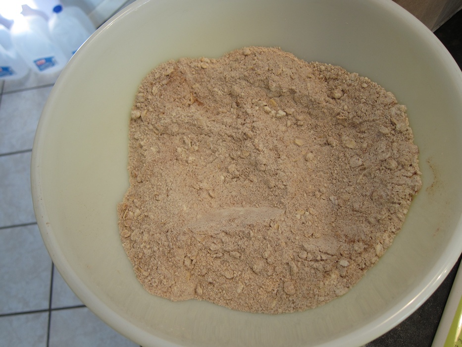 In a large bowl, stir together the flour, sugar, oats, flax meal, cinnamon, xanthan gum, baking soda, and salt.