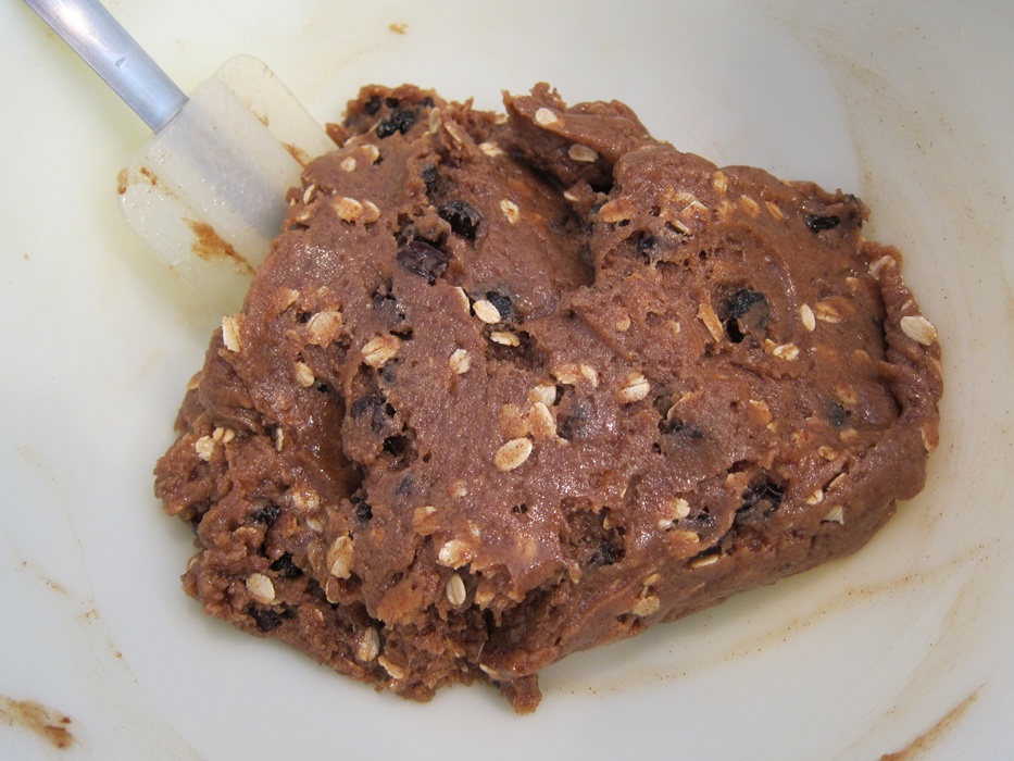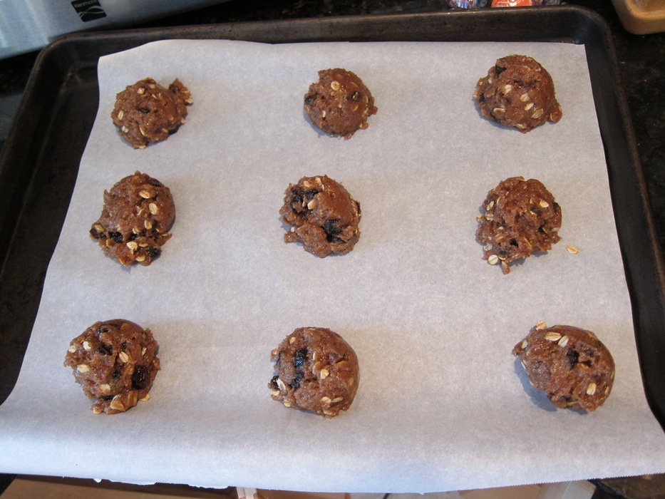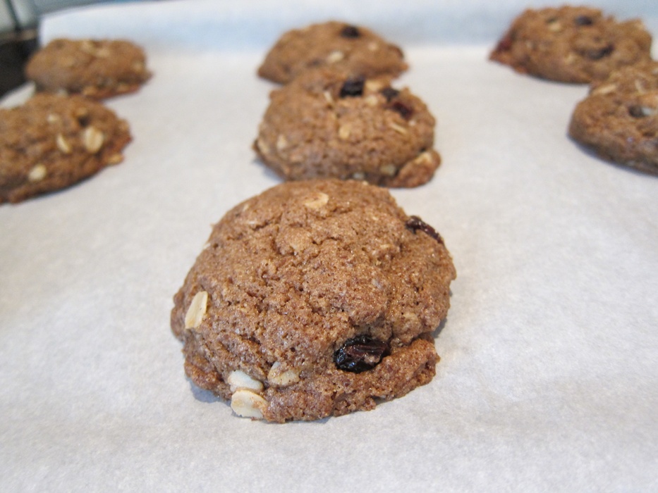 In a large bowl, stir together all of the dry goods except for the raisins. Add the liquids and stir until evenly combined. Add the raisins and stir until evenly distributed. Drop by tablespoonfuls onto the lined sheets, about 1″ apart.