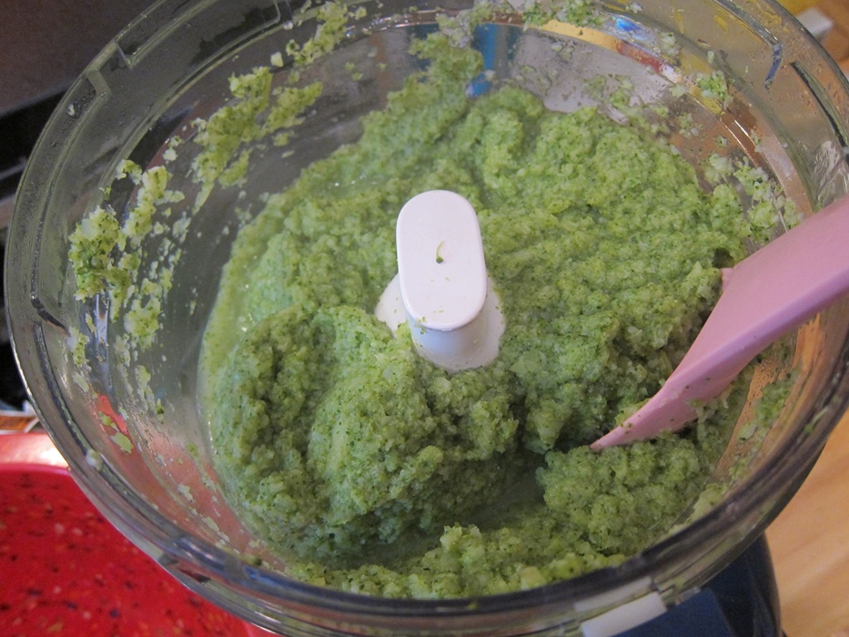 Begin by bringing the 1 1/2 cups of water to a boil in a medium saucepan on the stove. Once the water is boiling, add the broccoli and cover the pot. There probably won’t be enough water to cover all the broccoli – that’s ok. Cook for 3-4 minutes, then transfer both the broccoli and the water it was cooking in to a food processor or blender and puree until pretty smooth.