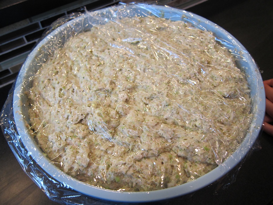 IMG_4618Cover the mixed dough (not airtight) and let rest until it rises and collapses, about 2 hours. You can then either use it right away, or refrigerate up to a week. This recipe makes three batches, so you can do them at different times over the week.
