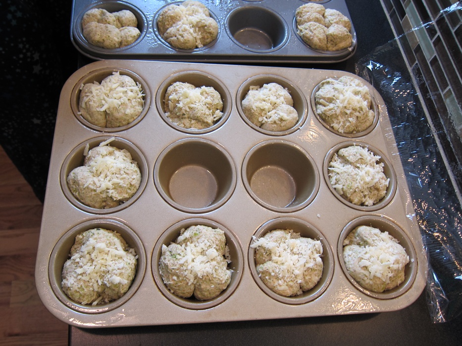 On the day you want to bake, grease a muffin tin well. Separate out 1/3 of the dough and shape into a ball. Divide that ball into 8 smaller balls, and then each of those 8 into 4 even smaller balls. Put each group of four small balls into one muffin cup. It helps if you put them all in at once, because up at the top where it’s a bit wider they all fit in better than if you try and smoosh them one at a time into the bottom of the cup. We did some with 3 balls per cup, and some with 4, and the ones with 4 looked better at the end, I thought.
