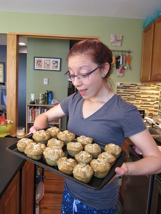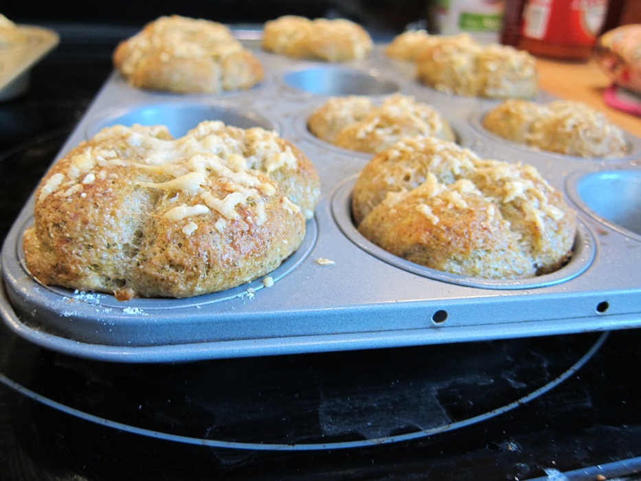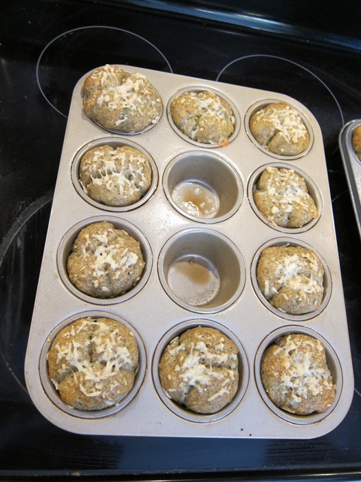 IMG_4707 IMG_4706Place the muffin tin on the hot baking stone, and put 1 cup of hot water in the empty pan in the bottom. (Use cast iron or a pan you don’t mind warping.) Bake 20-25 minutes, until browned and firm.