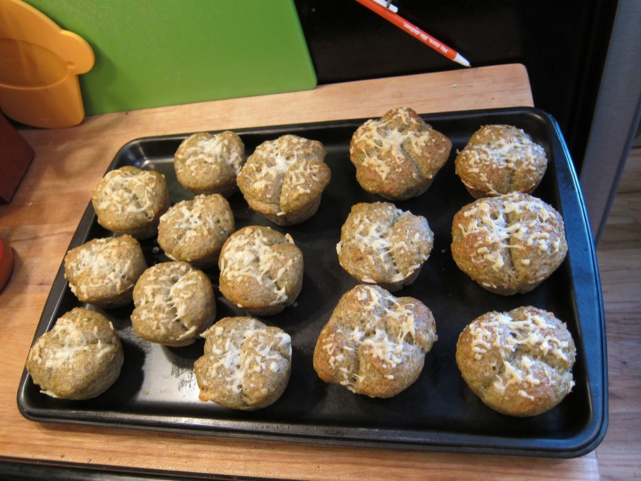 Sprinkle one cup of the cheese over the risen dough, then slide the muffin tin on the hot baking stone, and put 1 cup of hot water in the empty pan in the bottom. Bake 20-25 minutes, until browned and firm.