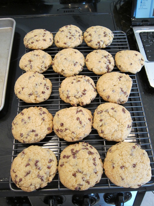 Stir in the chocolate chips, then divide the dough into 16 balls. You might as well use your hands to stir in the chips, since you’ll be using them to shape anyway. Gently flatten the balls, and place them well spaced apart, 8 to a baking sheet.