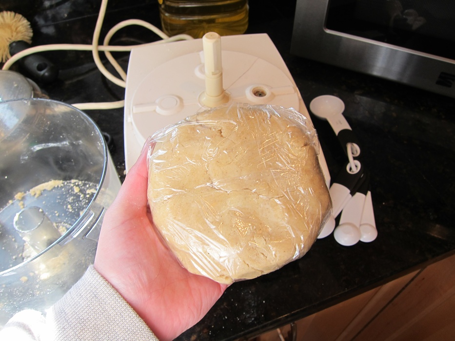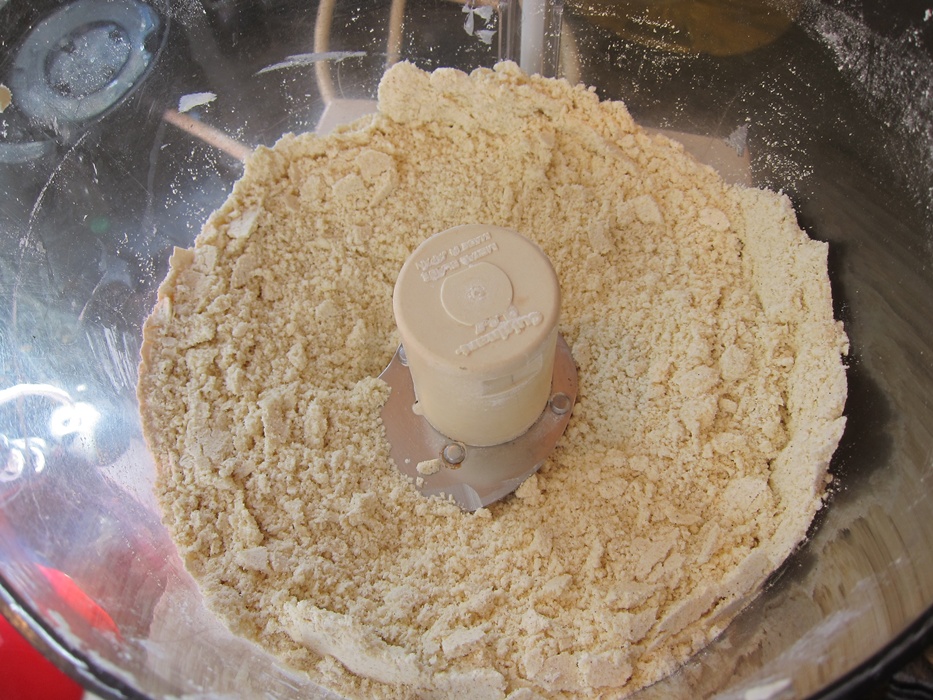 Put all the ingredients except the water in a food processor, and process in short bursts until it’s been processed for about one minute total. Add 2 tablespoons of the water and process (this time continuously) for 1-2 minutes, until the dough comes together in a ball. Add remaining water as needed until dough comes together.