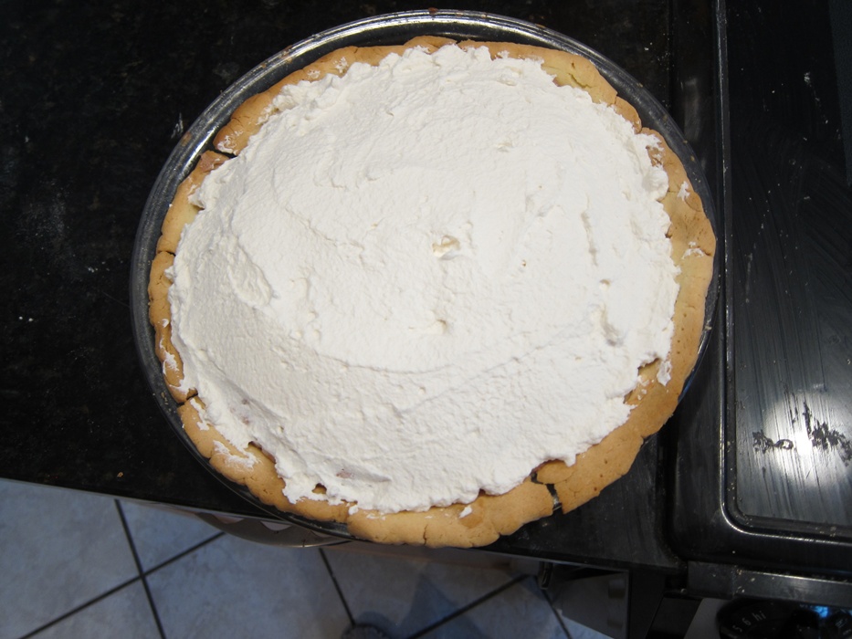 While the pie sets, beat together the cream, remaining teaspoon of vanilla, and the powdered sugar until stiff peaks form. Spread on top of the pie filling.