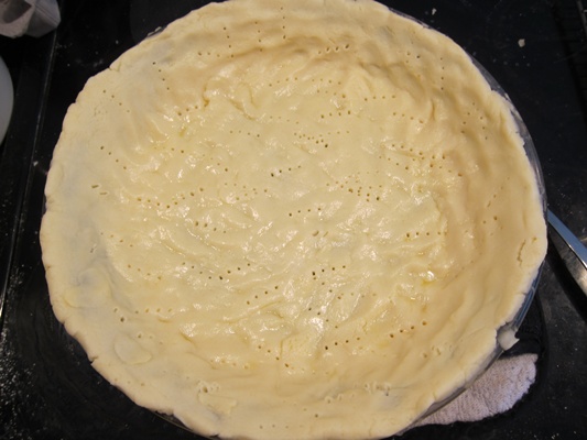 To use the prepared dough later, form each half into a disk about 1/2″ thick, wrap in plastic, place in a freezer bag, and freeze. When ready to use, thaw for 1 1/2 hours at room temperature, then roll out to a 10″ round between two sheets of wax paper. Place the pie pan up-side-down over the uncovered dough, then flip the wax paper, dough, and pie pan right-side-up. Remove the paper, straighten the dough, and prick all over with a fork, before returning to the freezer while the oven preheats and baking as above.