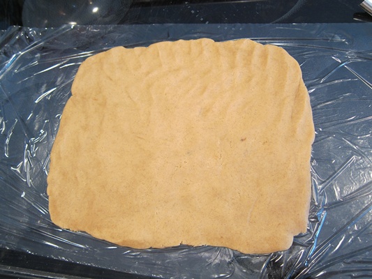 After freezing, take half the dough out of the bowl, putting the rest back in the freezer. Pat the dough out on a piece of plastic wrap into approximately a 9X12″ rectangle about 1/2″ thick.