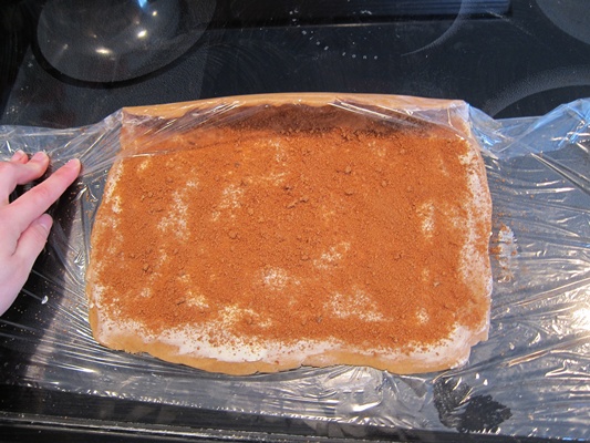 Spread half of the butter from the filling all over the dough, then top evenly with half of the brown sugar and cinnamon of the filling. Use the plastic wrap to curve the dough to start rolling the rectangle into a log.