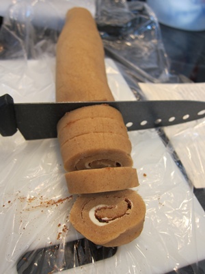 After freezing, cut the first log into 1/2″ pieces, placing the slices on two lined sheets. Bake 8-10 minutes, rotating in the middle, until lightly browned and firm looking. Bake the second batch of cookies, and transfer the first batch to a wire rack to cool.