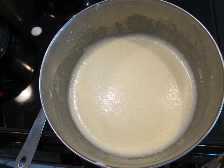Once all the half-and-half is in the egg mixture, transfer the whole mixture into the saucepan and put back over the stove on medium-low heat. Stir constantly until the mixture thickens enough to coat the back of a spoon, then remove from the heat.