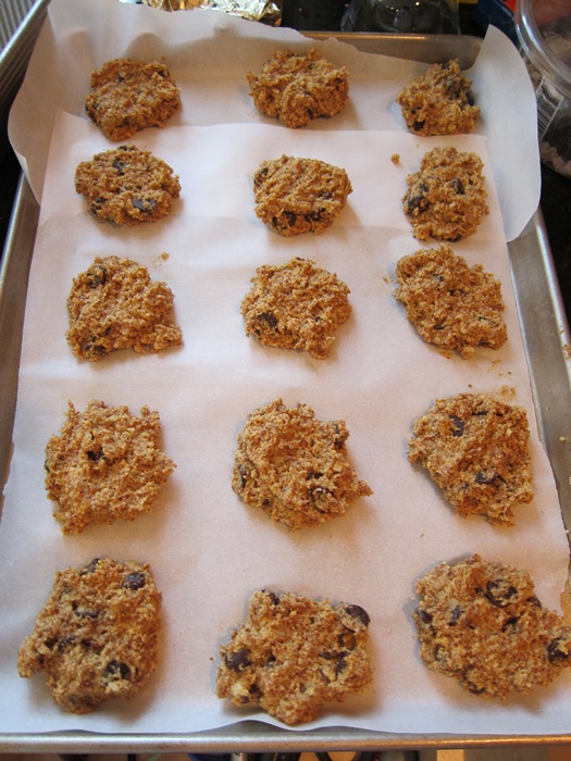 IMG_5550Stir the liquids into the dry mixture until just combined, then add the chocolate chips. Scoop heaping tablespoons onto the lined pans, then flatten slightly to about 1/2″ thick.