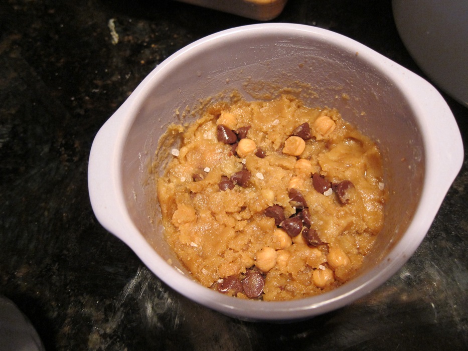 IMG_5563Microwave 40 seconds for a gooey-in-the-center cookie, or 60-70 seconds for a cooked cookie. There are a bunch of things that will impact how cooked yours gets, like how big your mug/ramekin is, how powerful your microwave is, and if you’re nuking a second one for someone else at the same time. Just play with it. I had a really big ramekin thing, so the dough was spread thinner than it would have been in a mug, and I did two at once, for a minute. I was pleased.