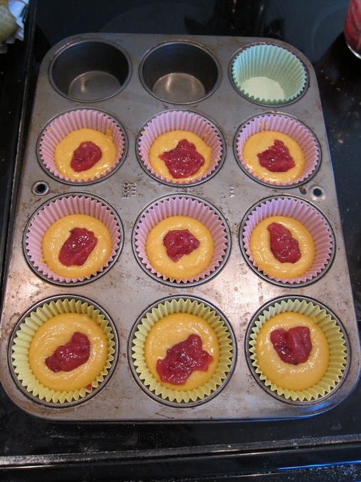Spoon two tablespoons of batter into each cupcake paper, add a heaping teaspoon of the jam mixture, and cover with a third tablespoon of batter.