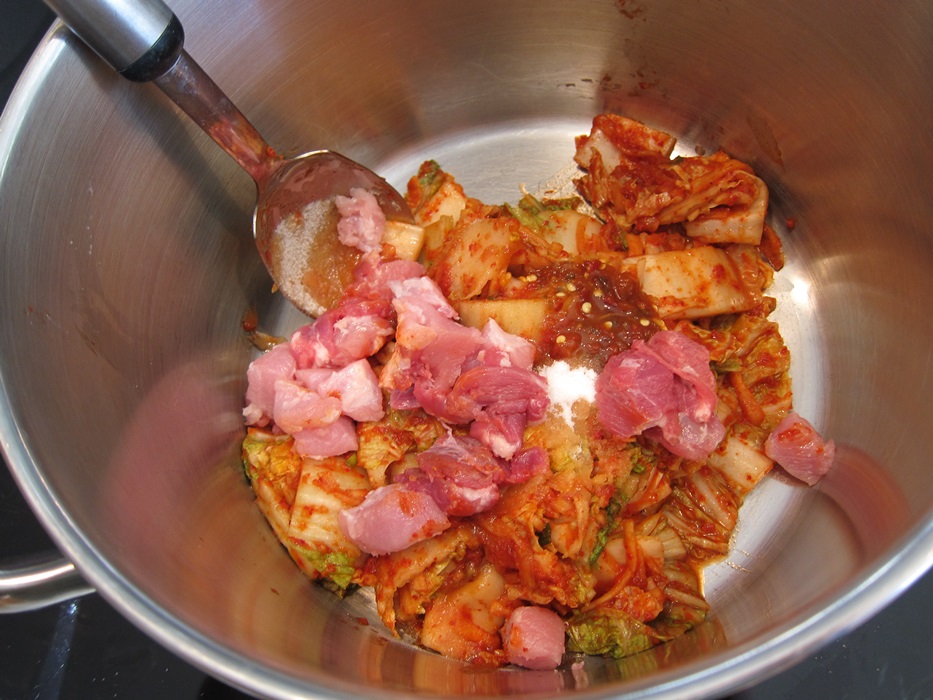 Combine the kimchi, pork, chili paste, and sugar in a heavy-bottomed pot.