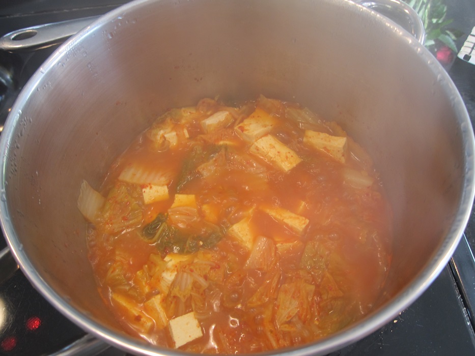 Combine the kimchi, pork, chili paste, and sugar in a heavy-bottomed pot. Add the water, cover, and bring to a boil. Boil half an hour, then lower the heat to medium-low, add the tofu, and cook another 10 minutes. Add the green onions and remove from the heat.