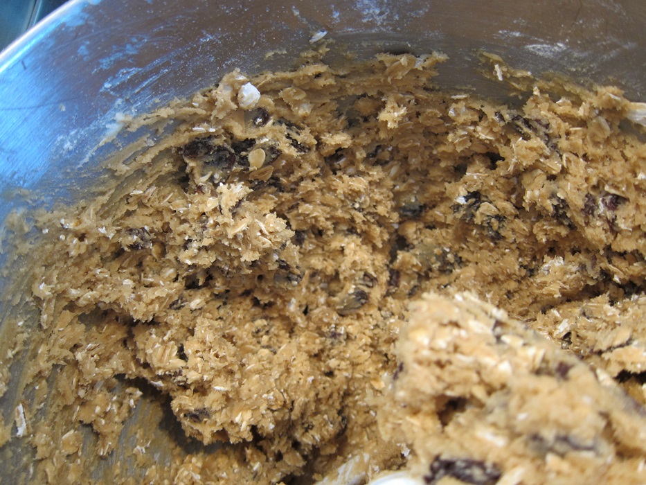 Beat together the butter, sugars, eggs, and vanilla until light and fluffy. Add the flour mixture and beat in on low, until just combined. Add the oats and raisins and again beat just until combined.