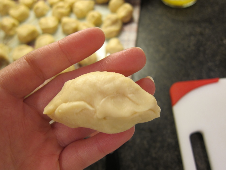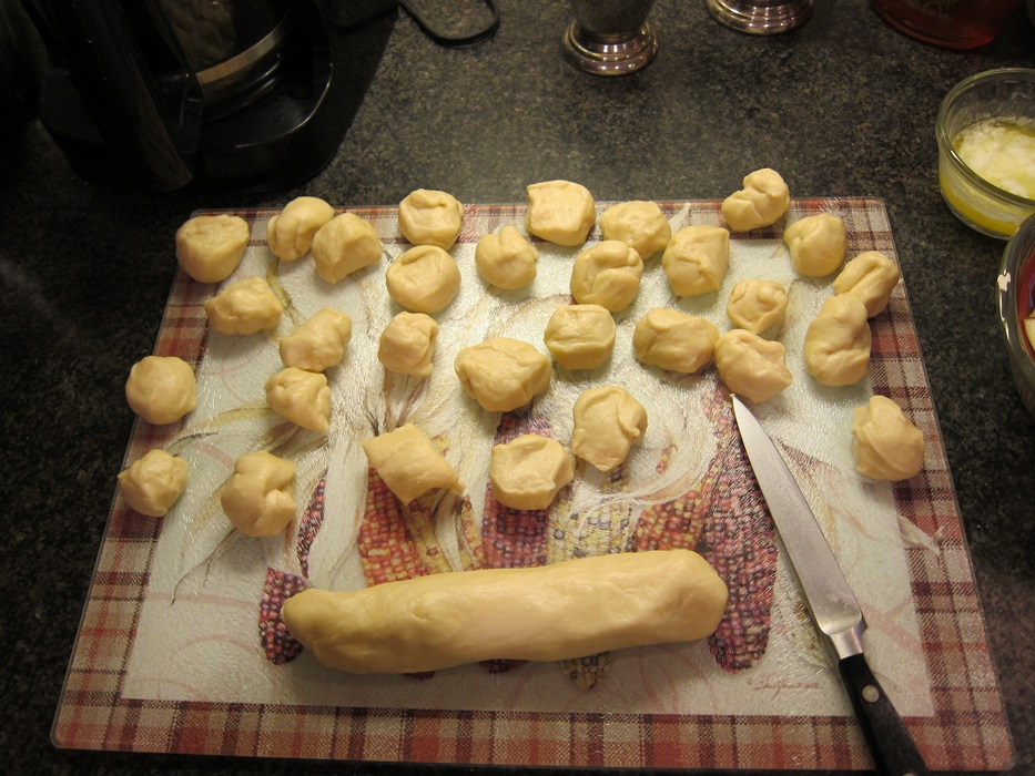 IMG_5697Divide the risen dough into quarters, then roll each quarter into a rope. Cut each rope into 10 pieces of dough.