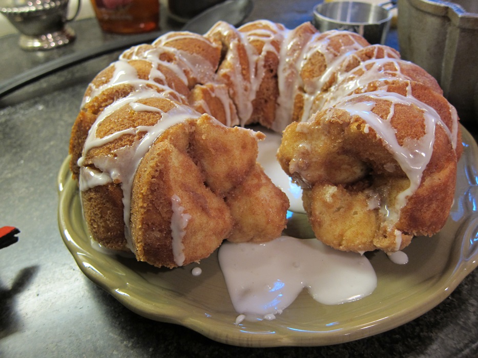 Let cool 10 minutes in the pan, then flip out onto a plate or platter. Whisk together the powdered sugar and enough milk to create a drizzle-able icing, then pour over the monkey bread.
