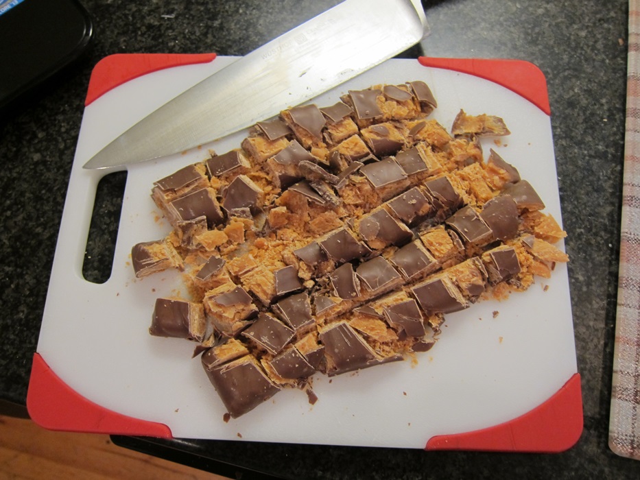 Preheat your oven to 350 degrees. Grease and flour a bundt pan. Chop the Butterfingers into small pieces, and set aside. If you leave big chunks, they’re prone to sinking in the batter, so pretty small works best.