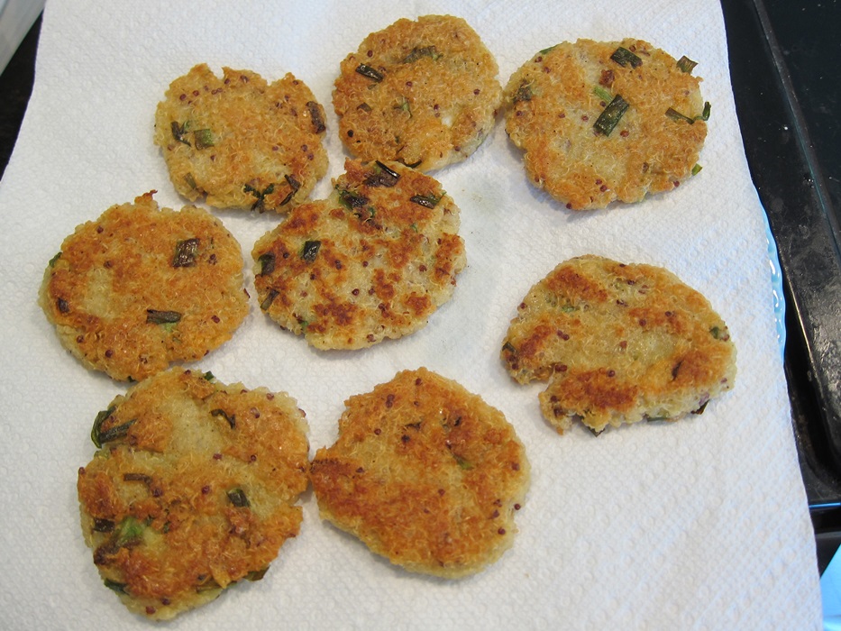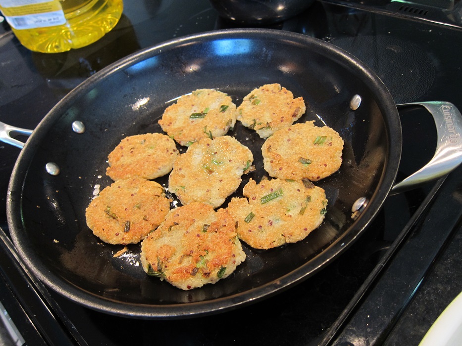 Heat the oil in a nonstick pan over medium heat. Form golfball sized portions of the quinoa mixture into flattened patties, and cook approximately 5 minutes on each side.