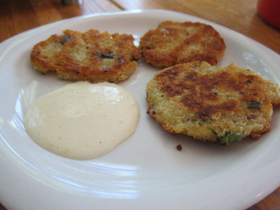 I think more cheese would have been nice, especially since they’re called “cheesy” quinoa cakes. They’re easy enough to make, and you can scarf enough of them, that I think you might as well make a double batch. The recipe makes enough aioli that you shouldn’t need to double that.
