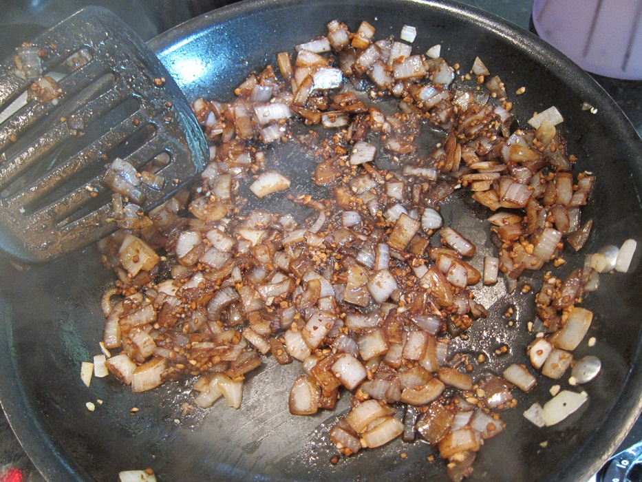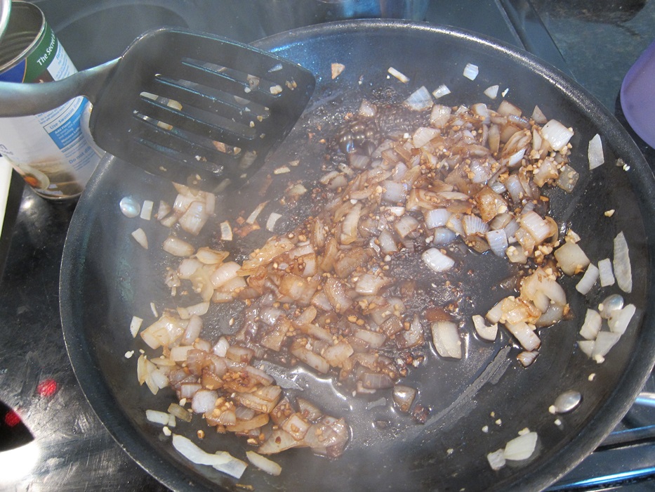 In a large saucepan (I used a frying pan, whoops), heat the oil over medium heat. Add the onion and cook until softened, about 5 minutes. Add the garlic and cook until fragrant, 30-60 seconds.