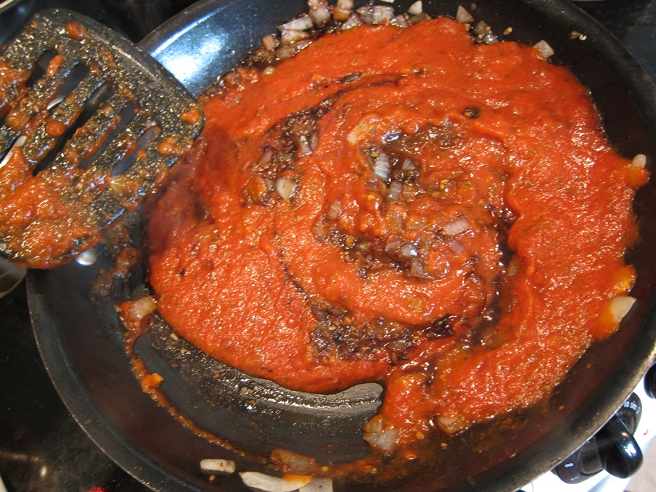Add the tomato sauce, diced tomato, pepper flakes, basil, salt, and pepper.