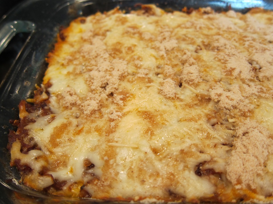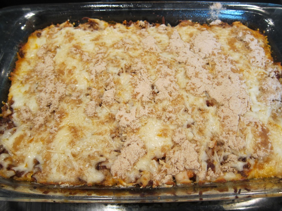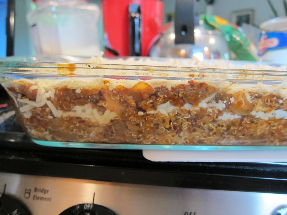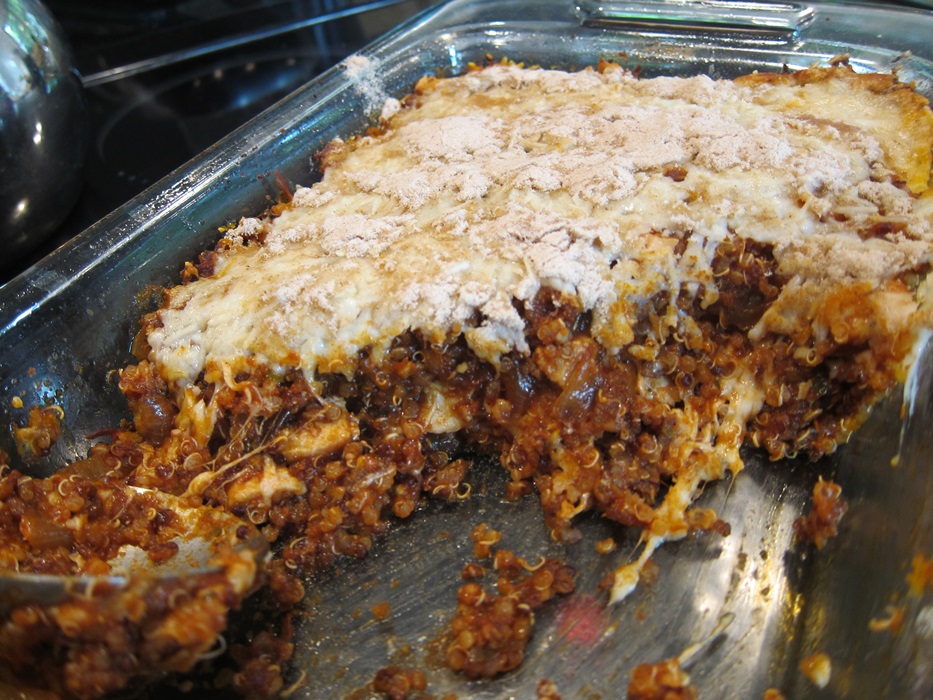 Spread half the quinoa mixture in the greased pan and cover with half of the mozzarella. Spread the remaining quinoa mixture on top, and again cover with the other half of the mozzarella. Sprinkle the Parmesan cheese over the mozzarella, then top with the breadcrumbs.
