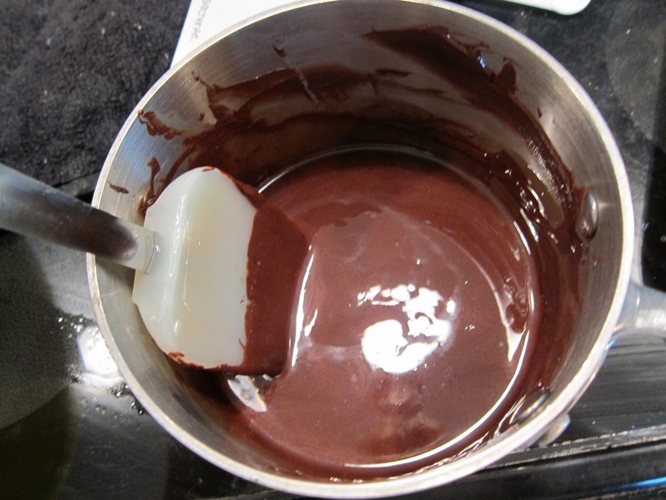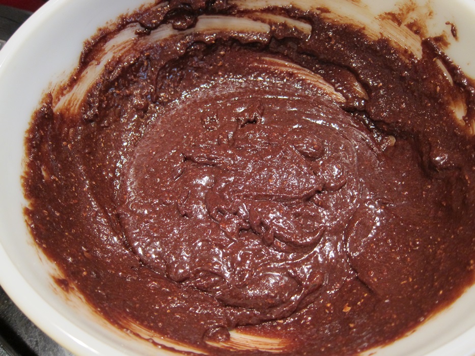 IMG_6096Whisk in the chocolate mixture, eggs, and vanilla, and continue stirring for about 2 minutes, until the batter is thick, smooth, and glossy.