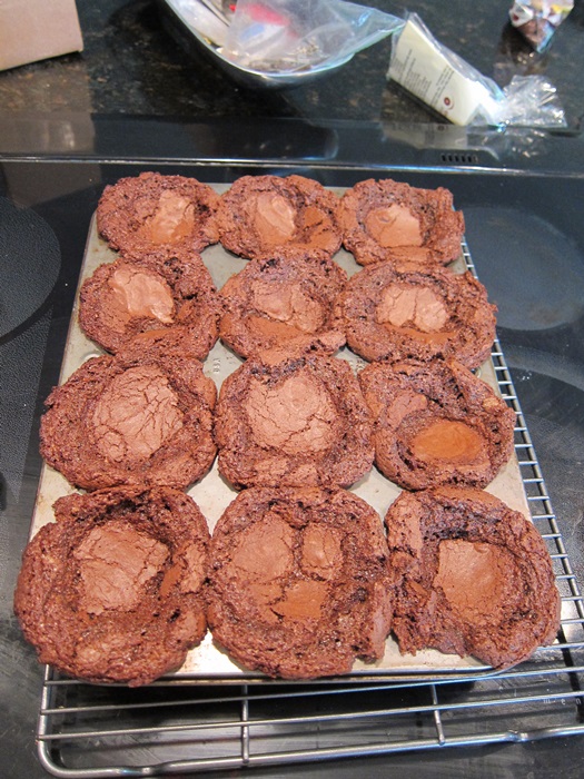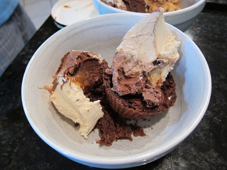 IMG_6102If, like mine, yours have expanded well beyond their little cups, cool in the pan (or put directly under ice cream!), but if they can be removed easily, cool on a wire rack. These are actually pretty nice still warm, with the chocolate chips still gooey amid all the other chocolate. Yum.
