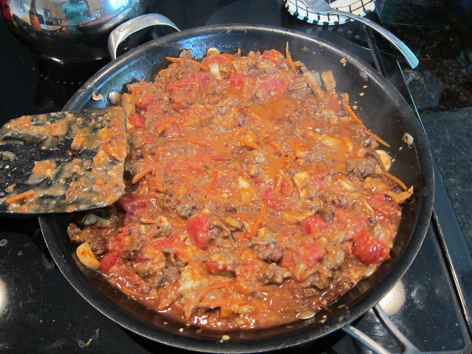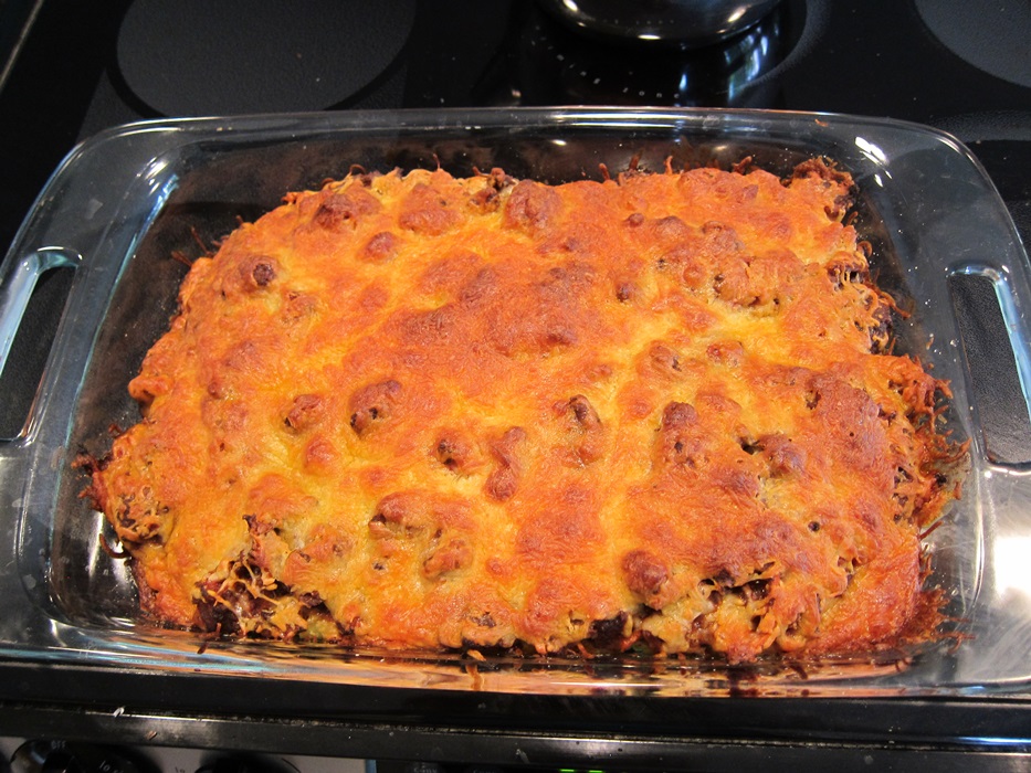 While the mixture thickens, boil the pasta according to package instructions and preheat the oven to 350 degrees. Spread the pasta along the bottom of a greased 9X13″ casserole dish. Spread the beef mixture over the pasta. Top with cheese, then bake until bubbly, about 45 minutes.