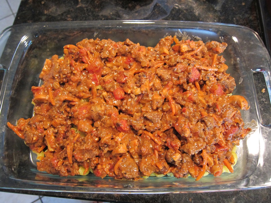 While the mixture thickens, boil the pasta according to package instructions and preheat the oven to 350 degrees. Grease the bottom of a 9X13″ baking dish. That wasn’t in the original recipe, but…would have been a good idea. Spread the pasta in the dish. (Whoops apparently you were supposed to have a cream of mushroom soup layer between the pasta and the beef mixture. Oh well, I liked it mixed into the sauce, so I’m leaving it there!) Spread the beef mixture over the pasta.