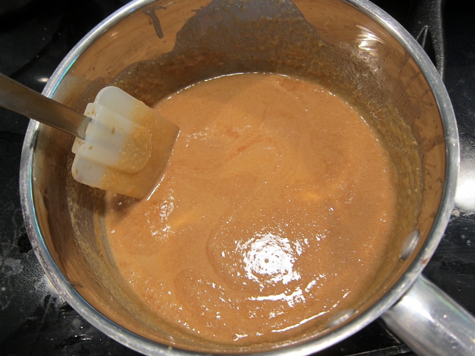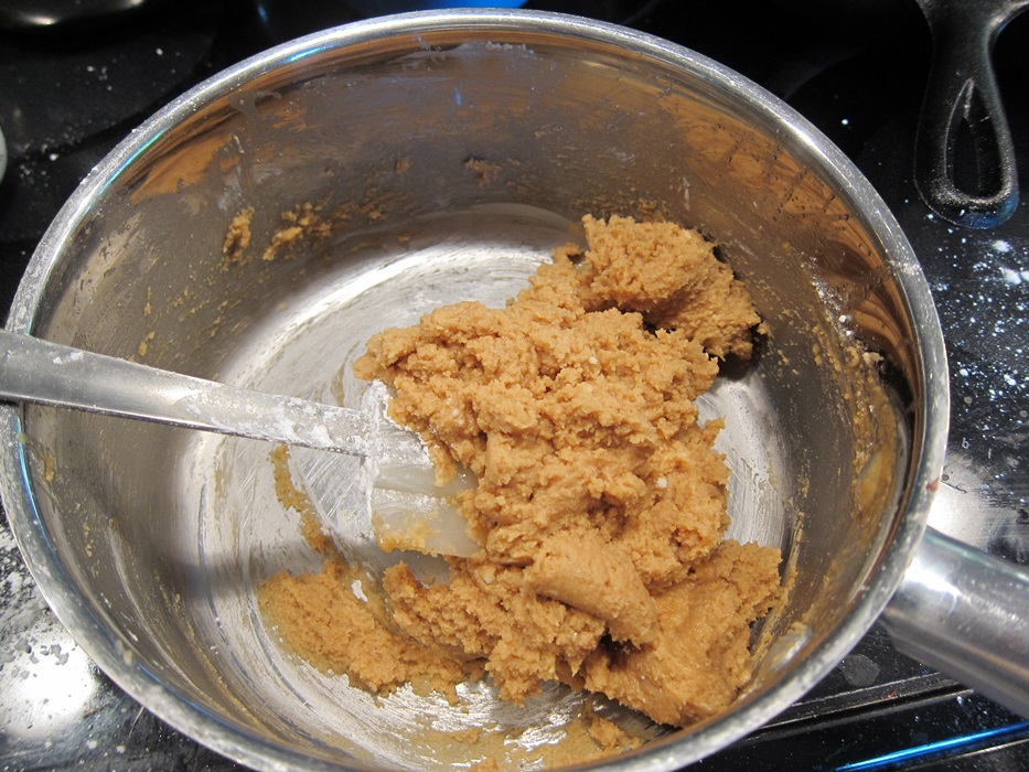 Heat the butter in a saucepan until melted, then stir in the brown sugar. Cook until the sugar is dissolved, then let the mixture bubble a minute or two. Remove from the heat and whisk in the peanut butter, then the vanilla. Let cool completely, about 20 minutes.