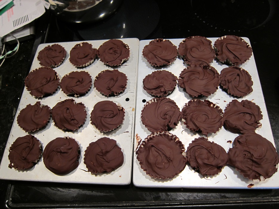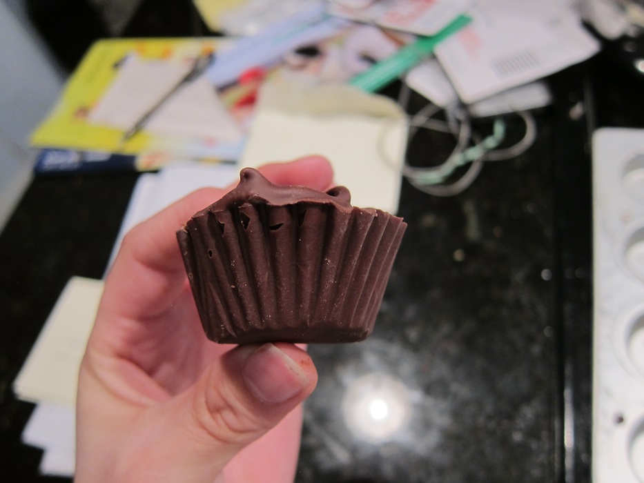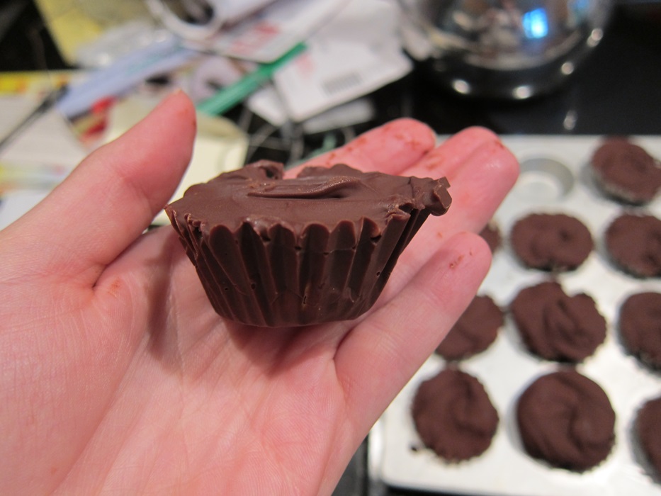 While you wait, melt half the chocolate and line 2 mini cupcake tins with papers. Spoon 1/2 – 1 teaspoon of the chocolate into each paper and spread it around. I ended up picking up each paper and smearing the chocolate around to cover the inside, but you might come up with a smoother method. Seems like a delicate balance between too much chocolate to fit the filling, and not enough chocolate to make solid walls, in such tiny tins.