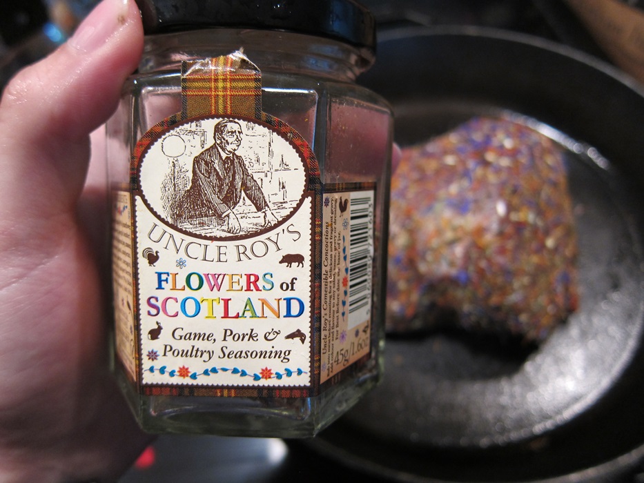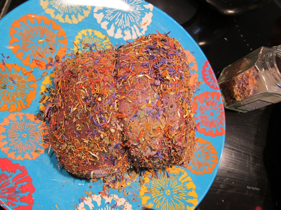 Roll the roast in your chosen herbs. The Flowers of Scotland mix is ever so pretty!