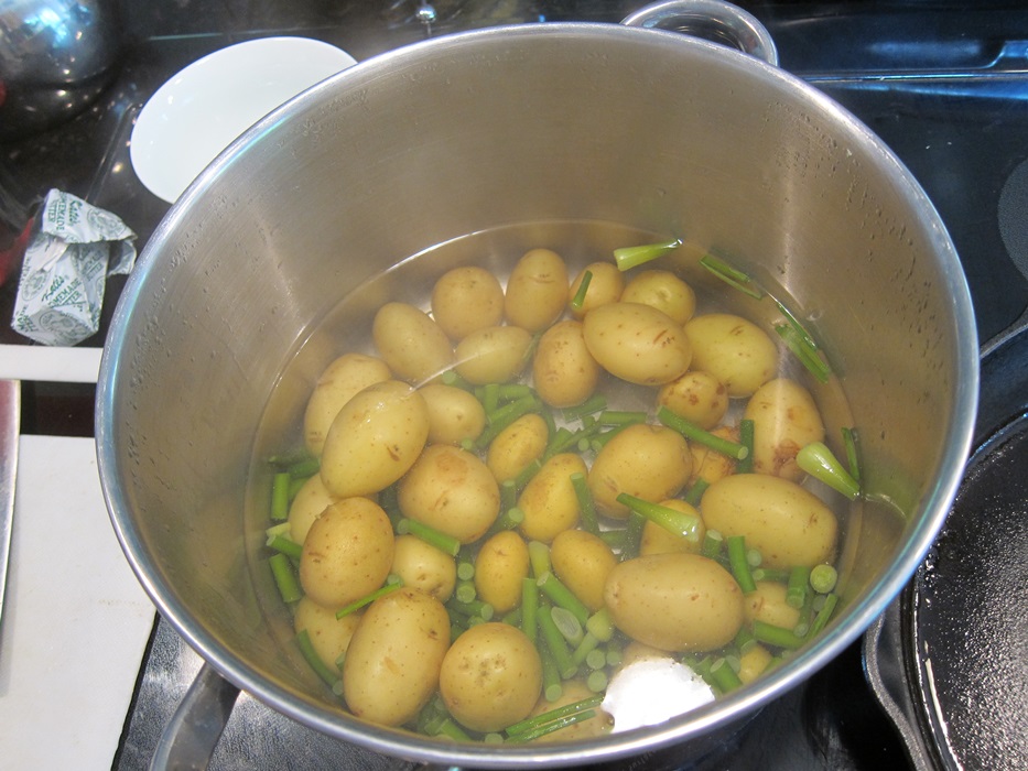 Bring the water to a boil, then add the scapes, cover, and remove from the heat. Let sit for 10 minutes, or until the potatoes are tender. You want to be able to easily stab one with a fork. Drain and set aside until cool enough to handle.
