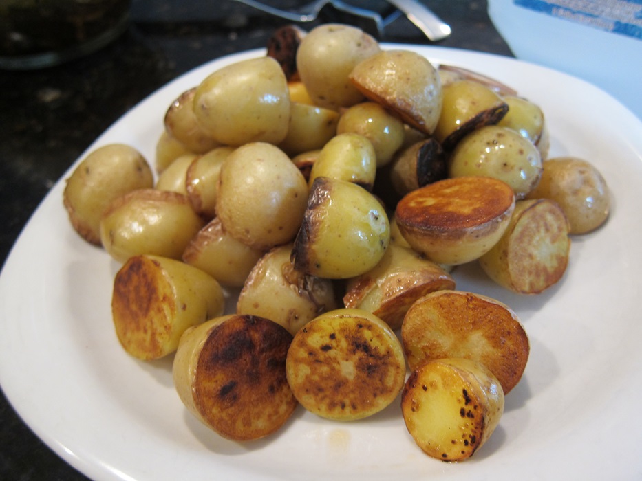 Heat 1 tablespoon of the oil in a skillet over high heat. While it warms, cut the potatoes in half. Cook the potatoes, cut-side down, until browned, a minute or two. Cook in multiple batches if necessary to ensure they all cook cut-side down, adding more oil for later batches if needed.