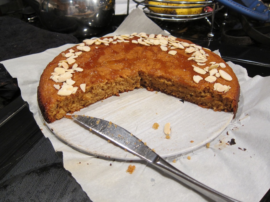 Sort of similar to the orange almond cake of a few weeks ago, this cake involves a food processor, a lot of eggs, and almonds. A very different result, though, although both have good flavors and textures.