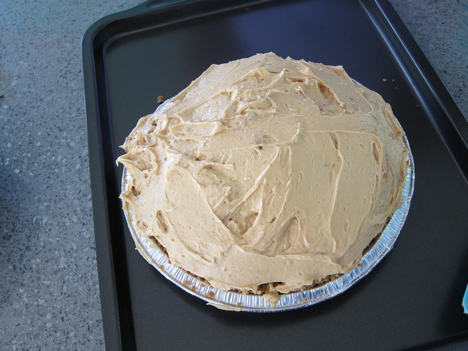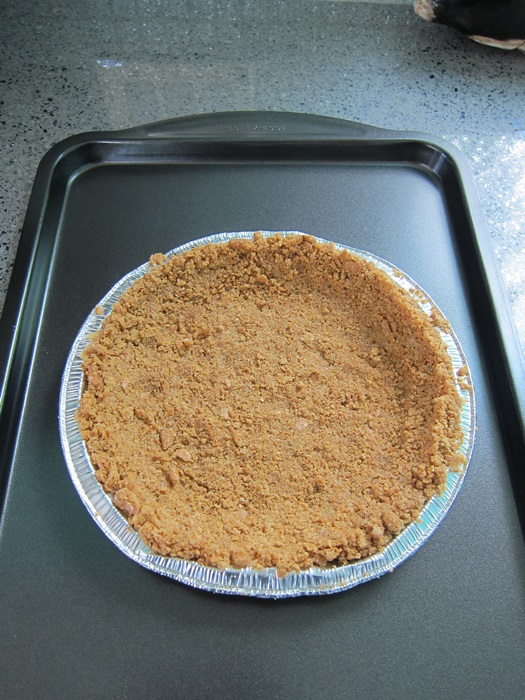 Mix together the grahams cracker crumbs, butter, and sugar, and press into the bottom of a springform or pie pan. A springform pan will be a bit bigger, and give you a slightly wider, thinner pie. We were working with a limited kitchen, so random pie tin from something else won.