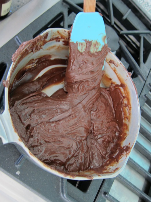To make the fudge layer, combine all the ingredients except for the Reese’s in a saucepan over low heat. Cook, stirring constantly, until smooth.