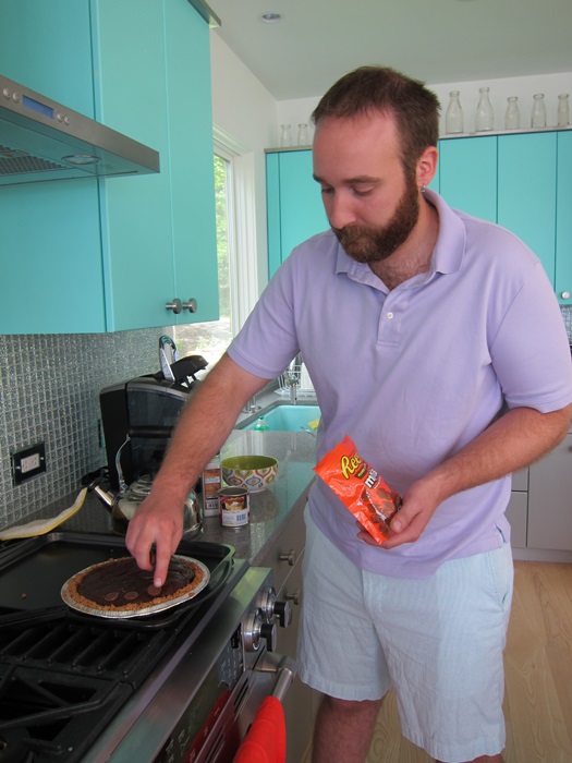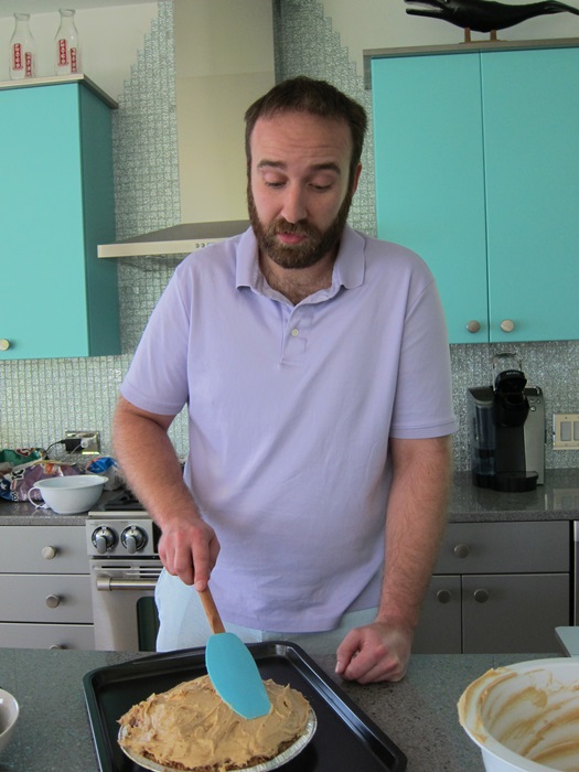 This pie is a really rich combination of graham cracker crust, fudge layer, and fluffy peanut butter top. As you’d imagine, those go really well together, and will leave everyone happily comatose. I made it with my friend Ted, who may not have been on the blog since January 2012, when we made Salted Caramel Butter Bars (oooh man!).