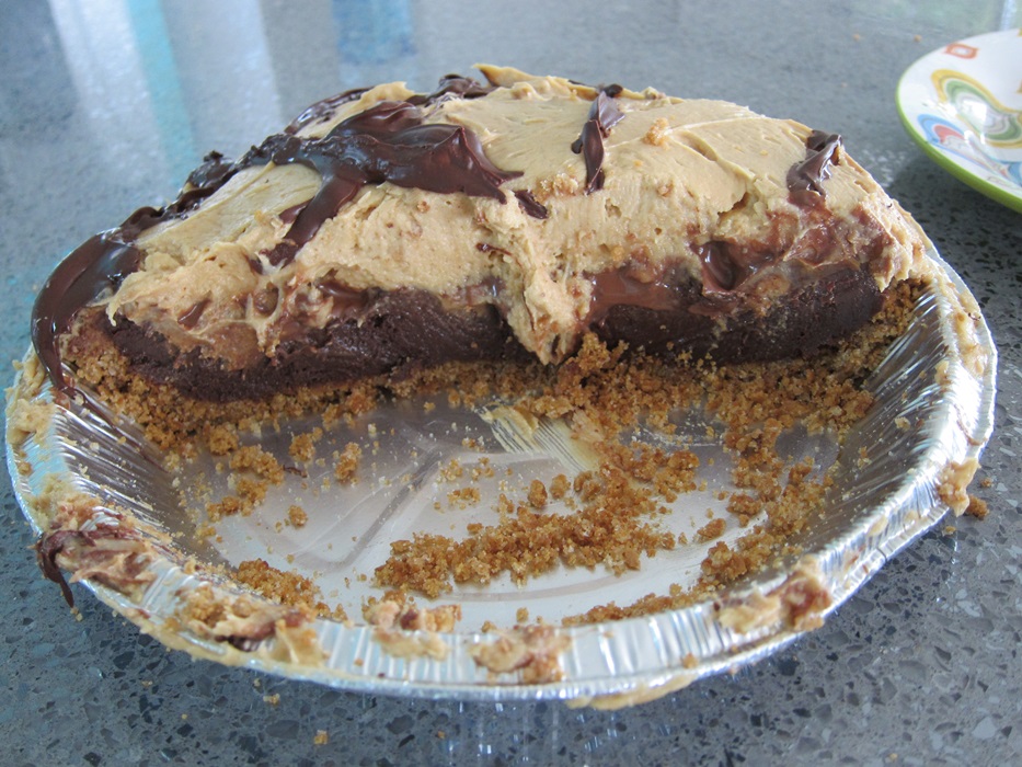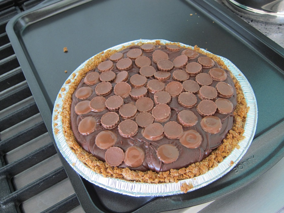 To make the fudge layer, combine all the ingredients except for the Reese’s in a saucepan over low heat. Cook, stirring constantly, until smooth. Pour into the pie crust, then press the Reese’s into the top of the fudge layer.