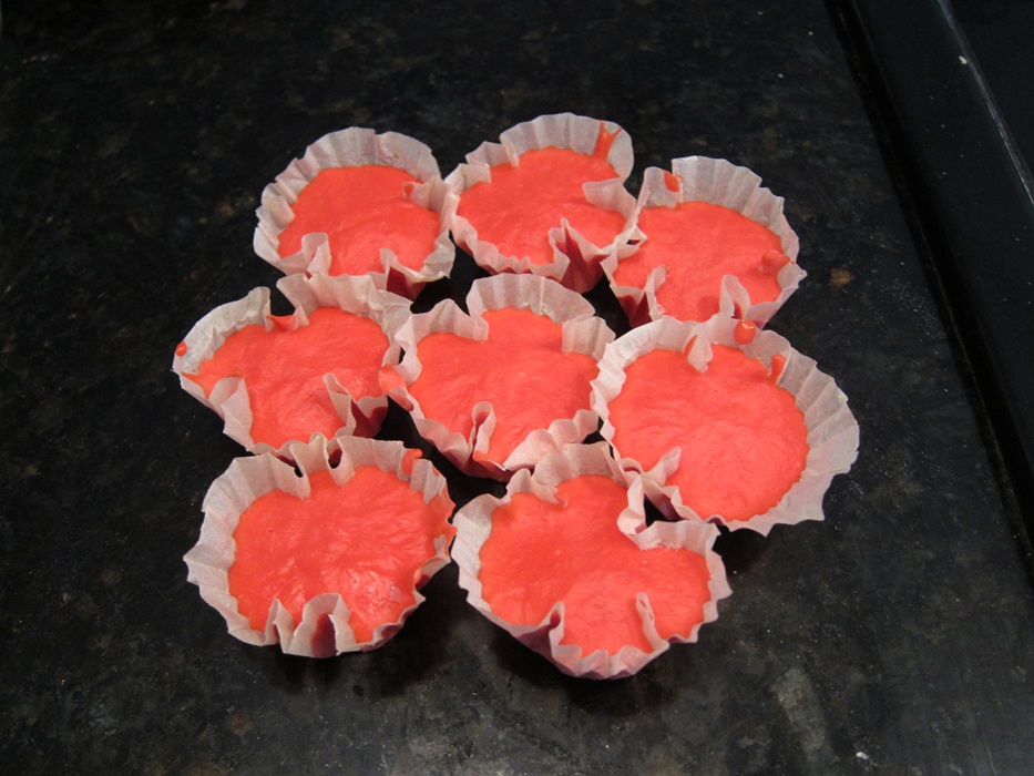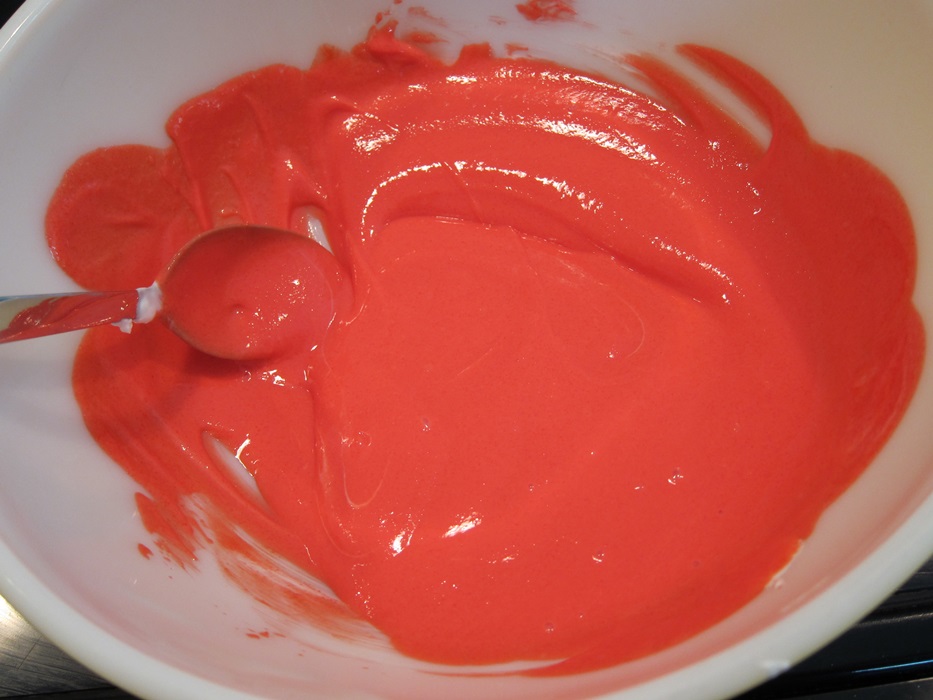 Microwave for 1 minute, stir, and microwave a second minute, to dissolve the Jello powder. Stir once more, then spoon into the lined pans.