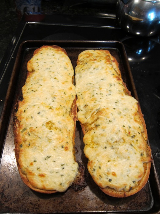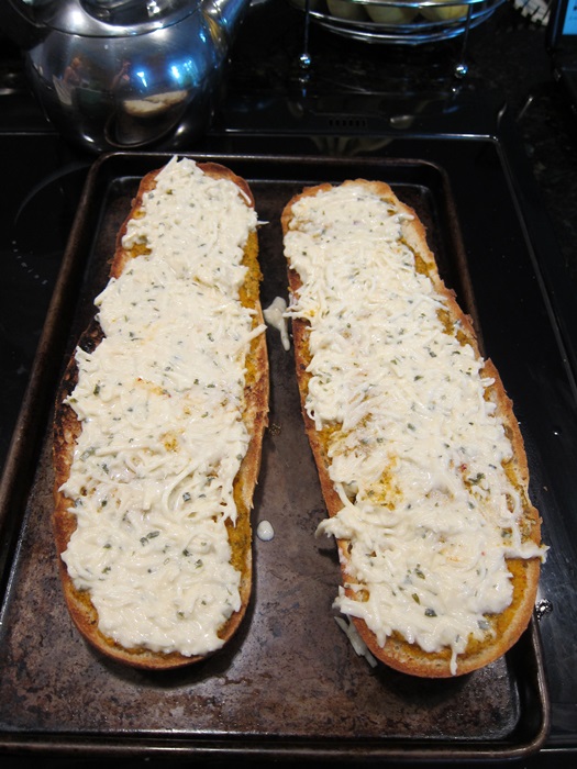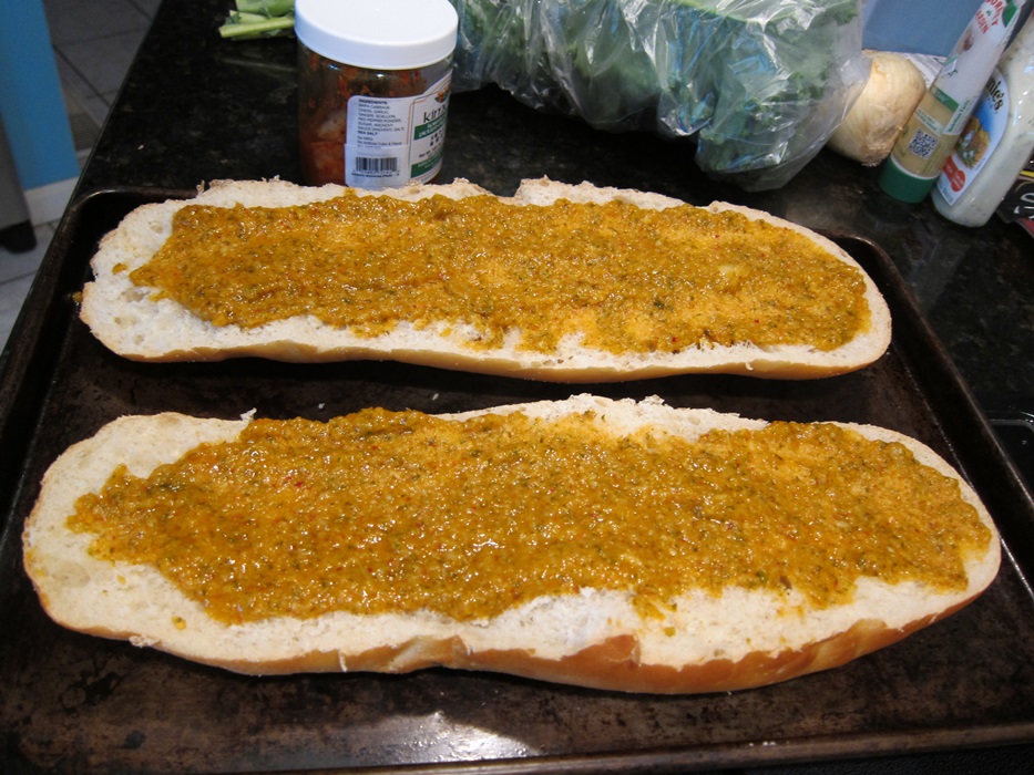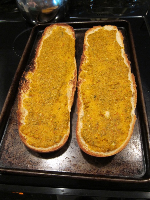Turn the mixture out into a nonstick skillet and heat over low heat until the butter melts and the mixture is smoother. Spread over the bread, then broil 2-3 minutes. Remove from the oven and turn the oven to bake, at 350 degrees.