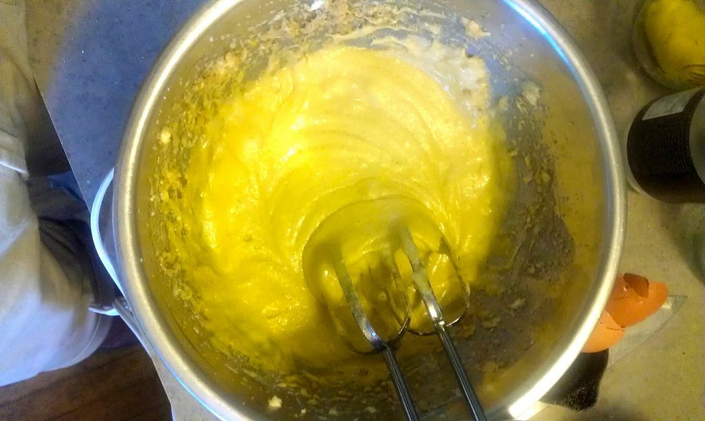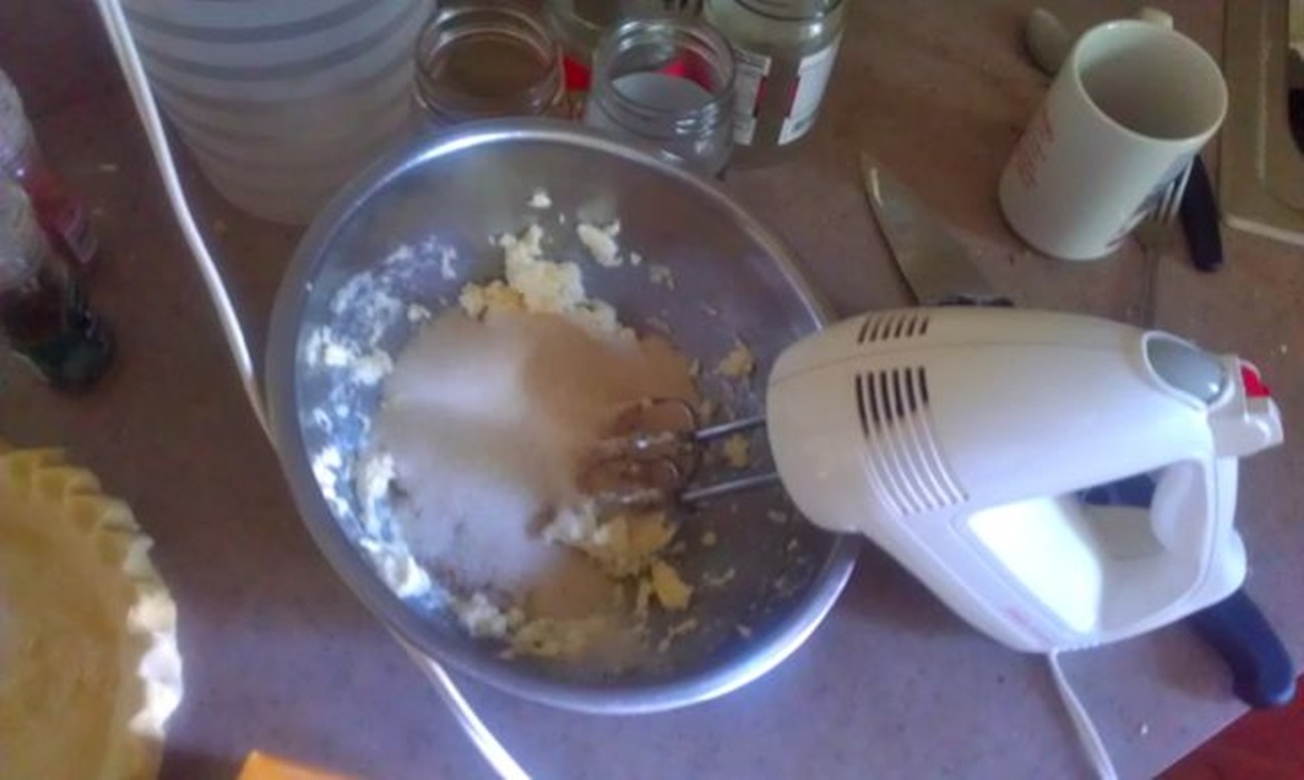 I let those sit for about six hours while I did more important things, then I came back and preheated the oven to 350F, set up my pie crust, and started mixing together the other ingredients. I creamed together a half cup of butter with a cup and a half of sugar.