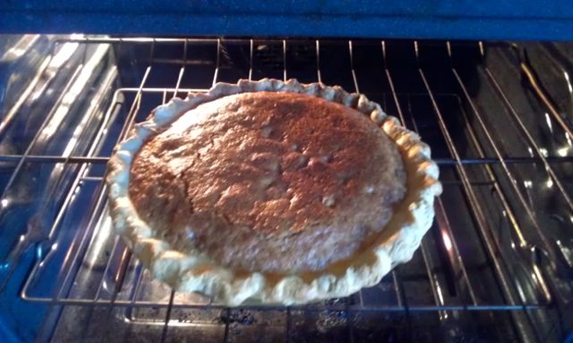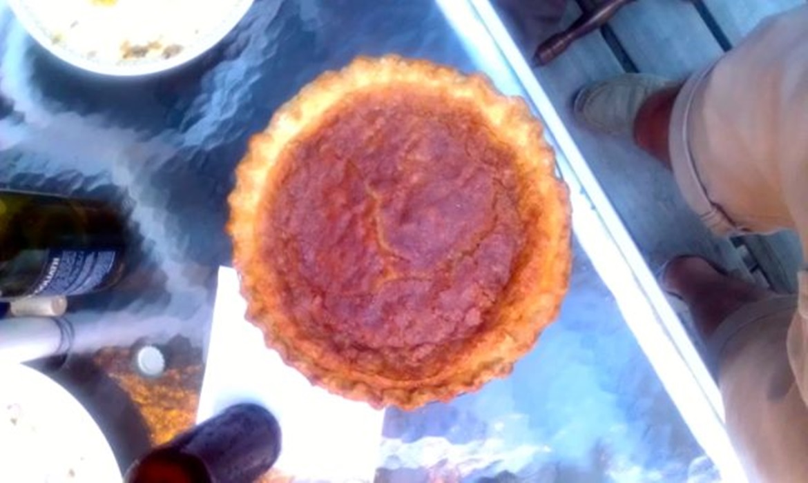 Pour the mixture into the unbaked pie crust and bake at 350F about 50 minutes, until the center has mostly set, but is still just a little wobbly – it will firm on standing. It should have a slightly darkened, crusty top. If necessary, cover the pan with a tented piece of aluminum foil or an overturned stainless steel bowl to prevent overbrowning while the pie bakes.