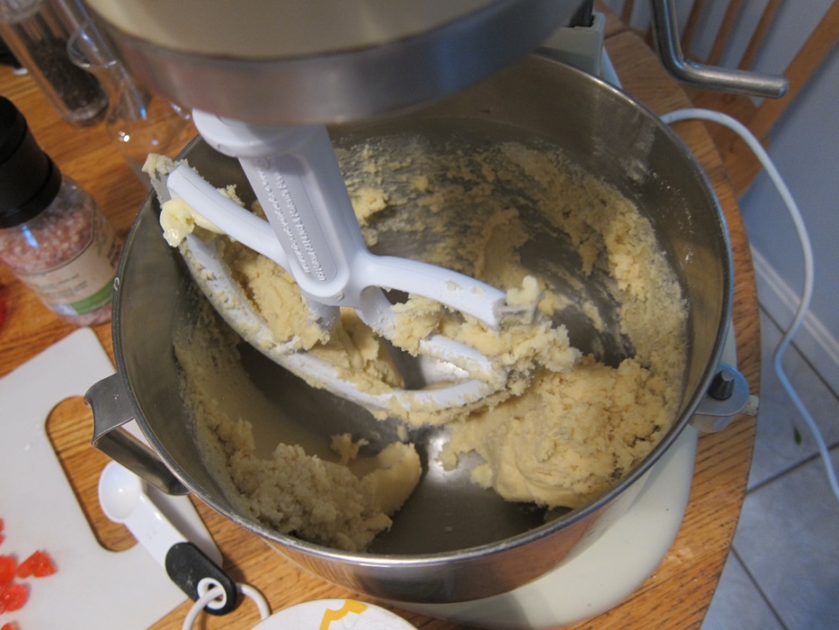 Cream together the butter and sugar until light and fluffy. Beat in the flour and xanthan gum on low speed. Add the vanilla and salt and beat on medium speed until combined. Add the cherries and beat in on low speed until evenly mixed.