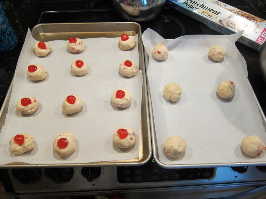 Scoop into roughly 1″ balls and space widely on the lined sheets. If desired, gently press whole candied cherries into the tops of the dough balls.
