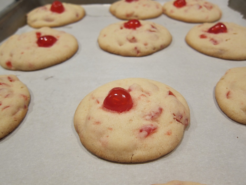Scoop into roughly 1″ balls and space widely on the lined sheets. If desired, gently press whole candied cherries into the tops of the dough balls. Bake 13-15 minutes, until just beginning to brown around the bottom edges.